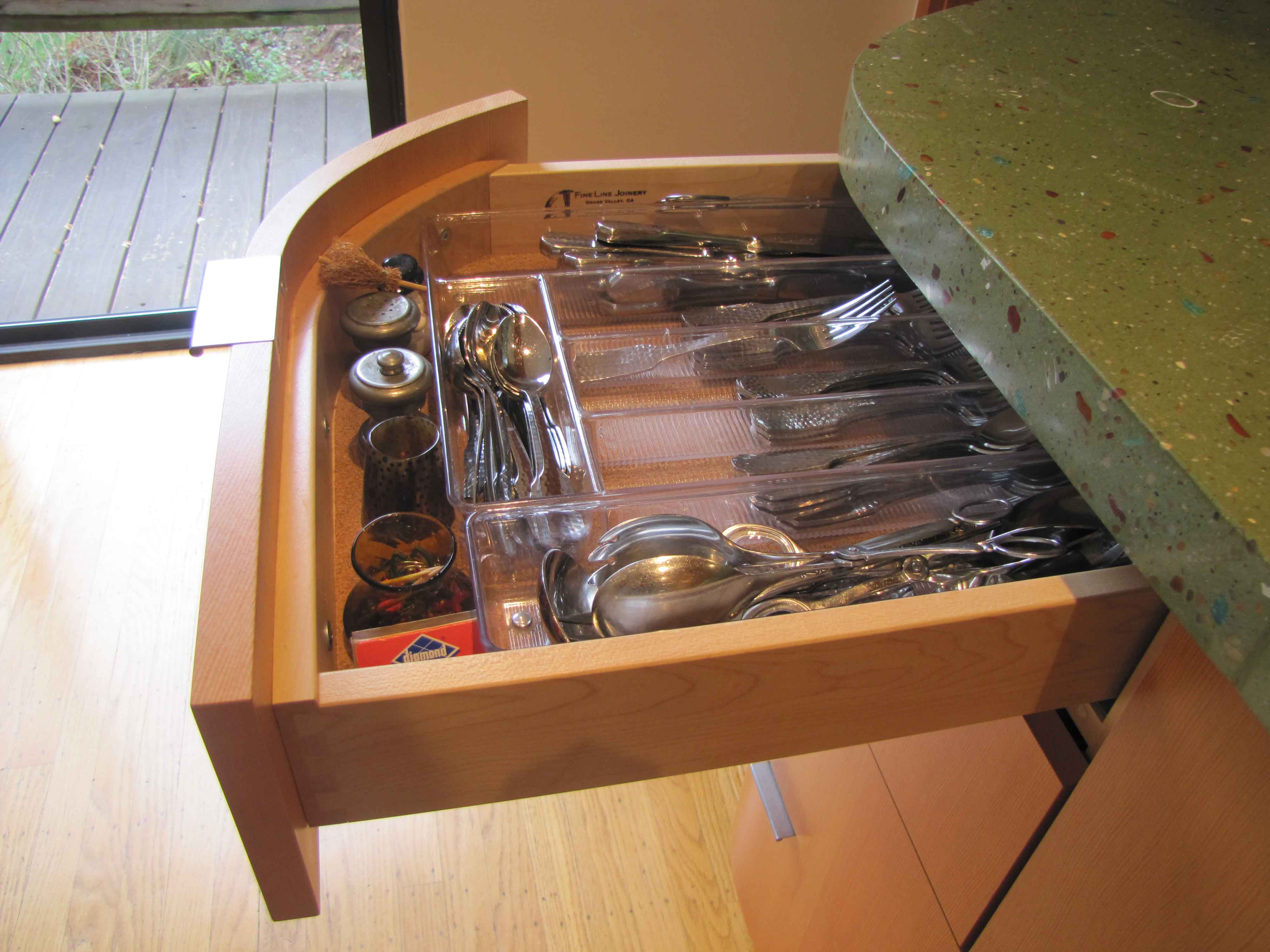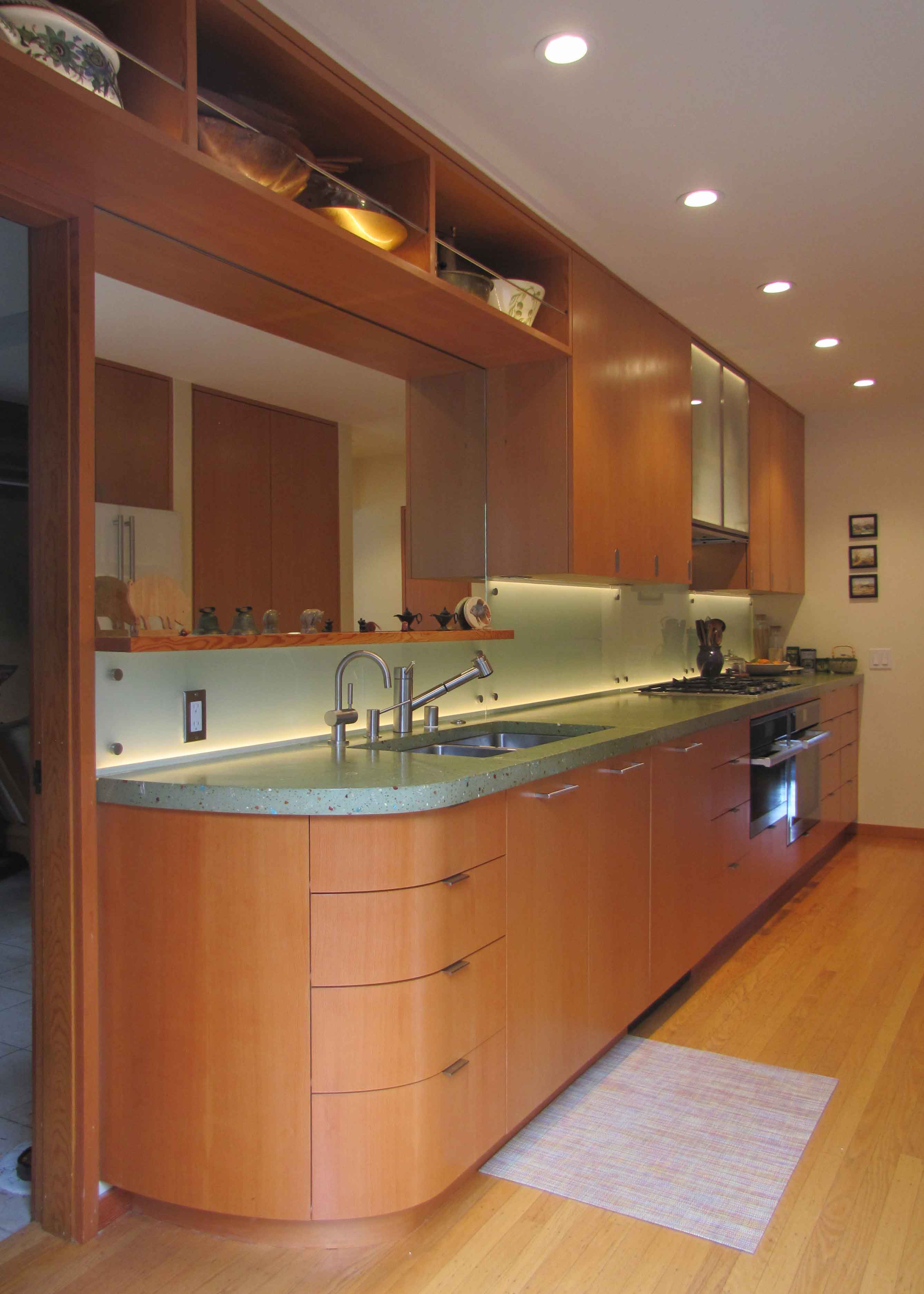 Vertical Grain Fir Kitchen Cabinets with Curved Front Drawres