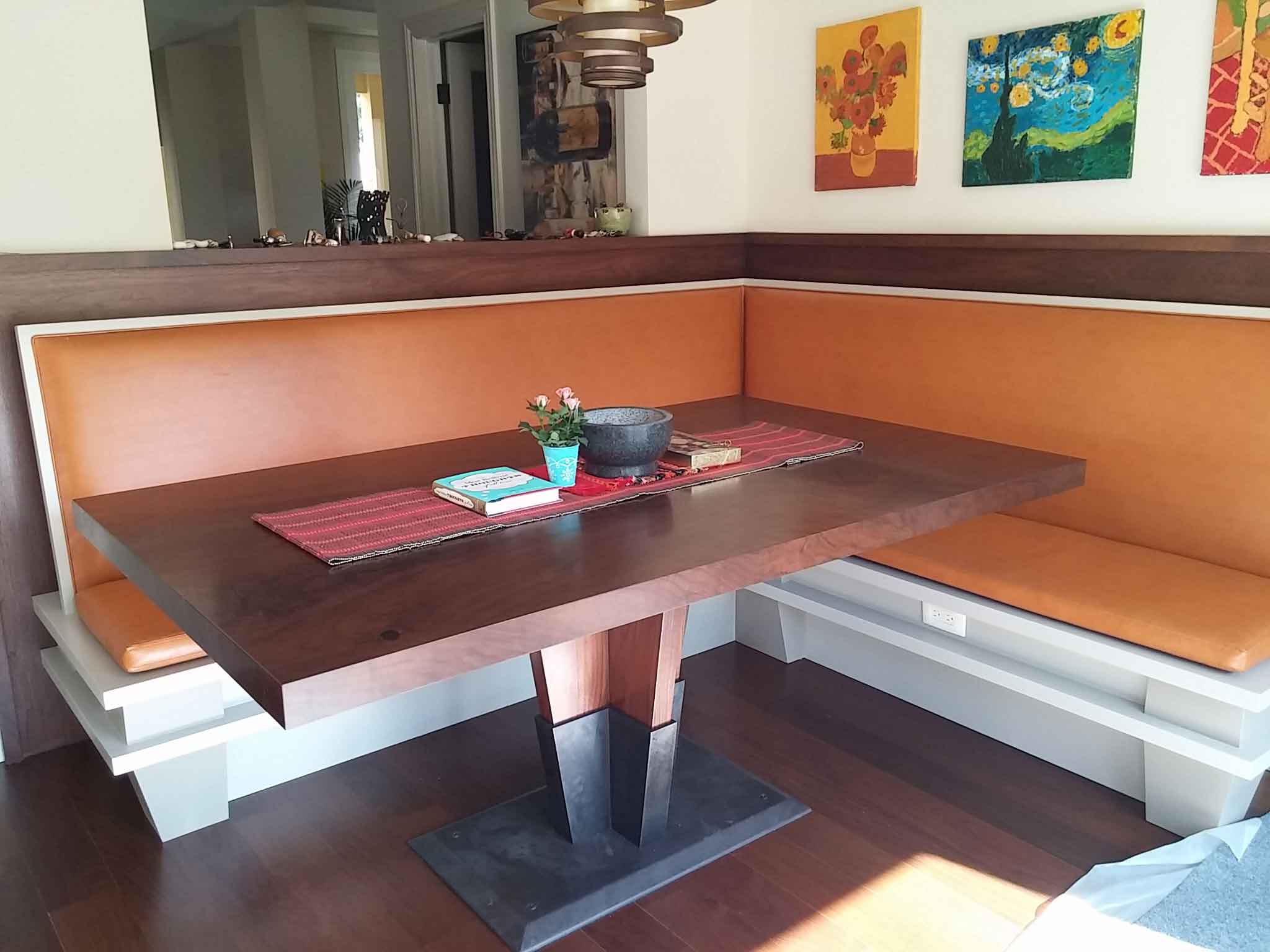 White Painted Media Wall Cabinets w/ Walnut Countertops and Shelves